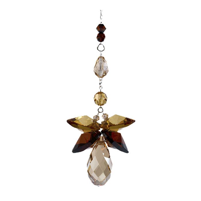 Lad dette engle-ophæng i ægte Swarovski®-krystaller fylde dit hjem med lys og varme. Kroppen er et facetteret dråbevedhæng i bløde, gyldne nuancer, der nærmest minder om solskin i sen eftermiddag. Vingerne glimter i dyb rav, honninggul og cognacfarvet krystal, og de matchende brune og gyldne krystaller på kæden samler det hele i et roligt, jordnært udtryk. Når lyset rammer englen, spreder de mange facetter blide gyldne reflekser, der skaber en følelse af hygge, tryghed og indre ro.