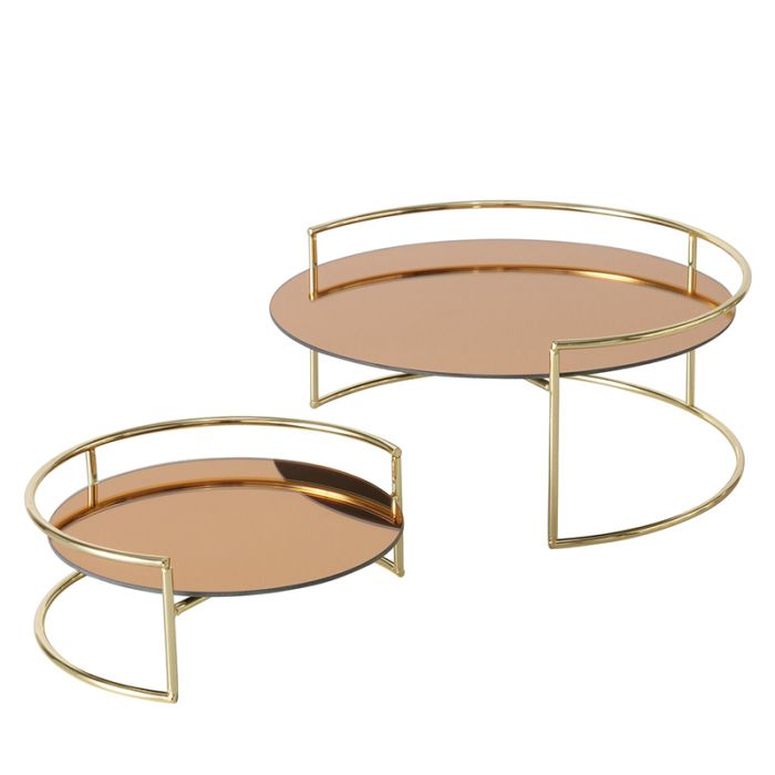 Tilføj et strejf af luksus til dit hjem med dette elegante sæt af to runde bakke-/sideborde. Designet kombinerer moderne minimalisme med glamorøs elegance, takket være den spejlblanke kobberfarvede overflade og den stilrene guldfarvede metalramme.