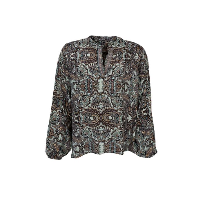 Feminin og unik bluse med v-hals og elastik ved ærmerne.