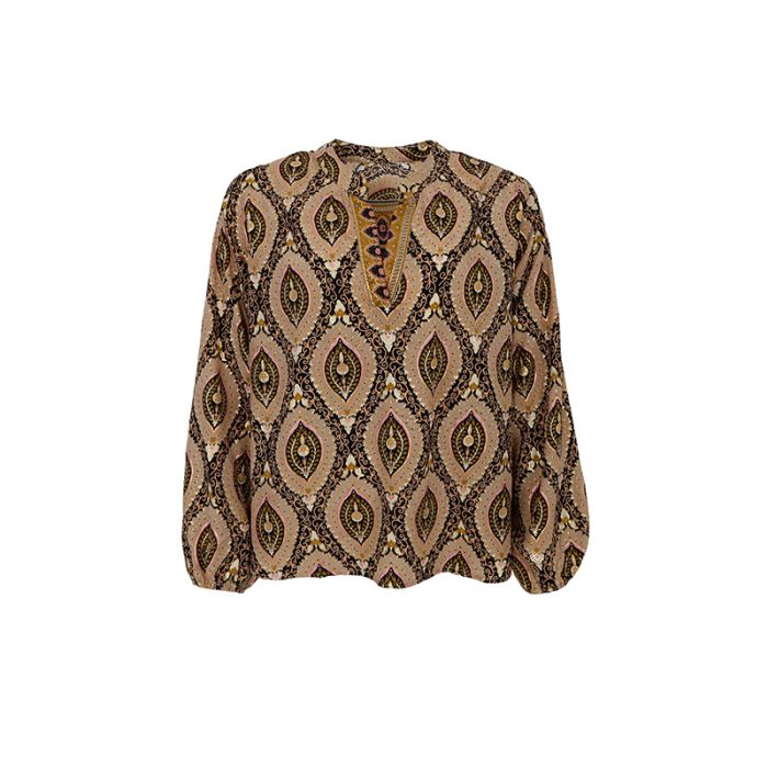 Feminin og unik bluse med v-hals og elastik ved ærmerne.