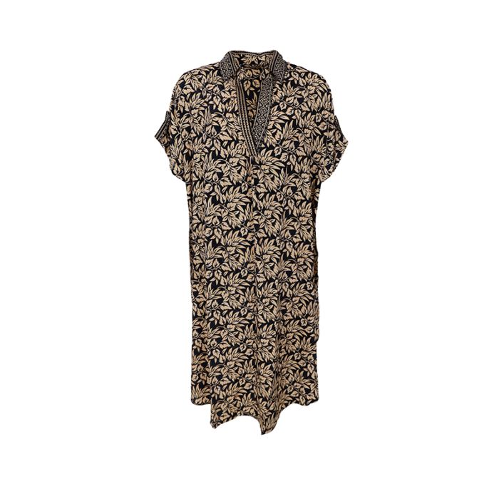 Kortærmet kaftan tunika med krave og lommer. Ærmerne har opsmøgstropper, kun til dekorative formål.