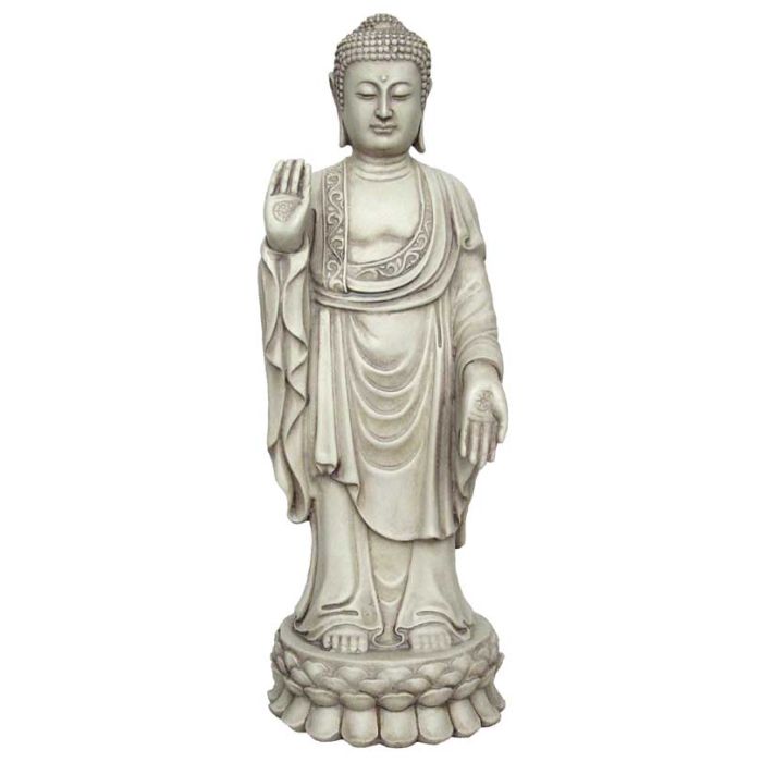 Smuk stående Buddha i sten finish med håndstillingen Abhaya Mudra, som symboliserer beskyttelse.