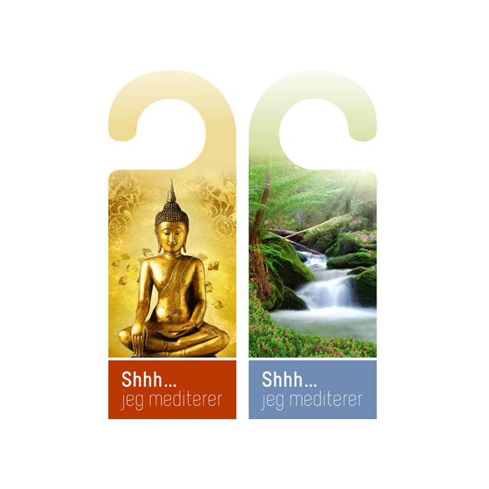Flot dobbeltsidet dørskilt med teksten "Shhh...Jeg mediterer"