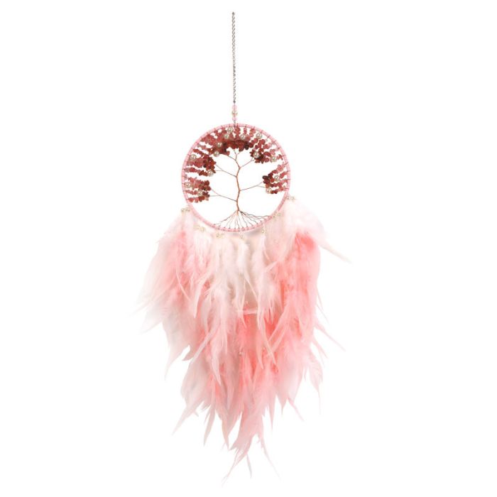 En flot og dekorativ drømmefanger med Lyserød/Rosa nuancer med karneol og jordbærkvarts chips og perler