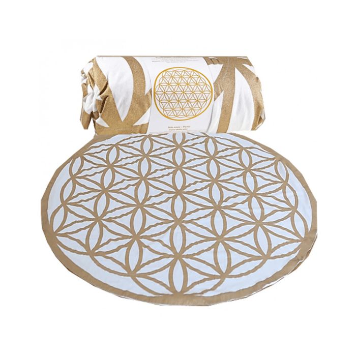 Et smukt hvidt og gyldent bomuldstæppe med symbolet Flower of Life, der feks. kan bruges som strand eller picnictæppe.