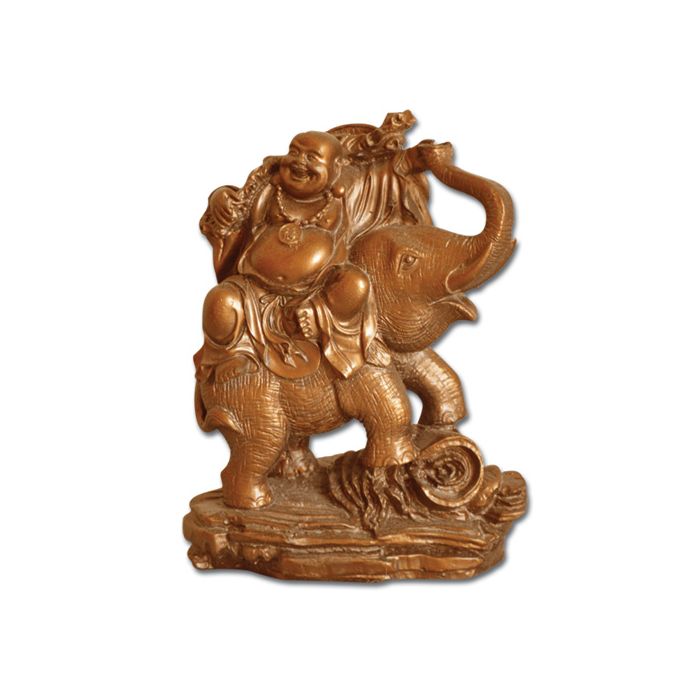 Denne buddha figur med elefant i et varmefyldt bronzeskær sætter straks et smil på læben og skaber en positiv atmosfære omkring sig. Det lykkelige ansigtsudtryk og den dynamiske positur udstråler en lethed, som lyser rummet op. Kombinationen af den glade buddha og den majestætiske elefant symboliserer både velstand, styrke og et åbent sind – kvaliteter, der gør den til en meningsfuld dekoration i ethvert hjem. De smukke detaljer fremhæves af den metalliske finish, hvilket vidner om et omhyggeligt håndværk, der balancerer mellem det legende og det sofistikerede. Denne unikke figur kan skabe et centralt fokuspunkt i stuen, entréen eller soveværelset, hvor dens charmerende energi kan inspirere til glæde og indre ro.