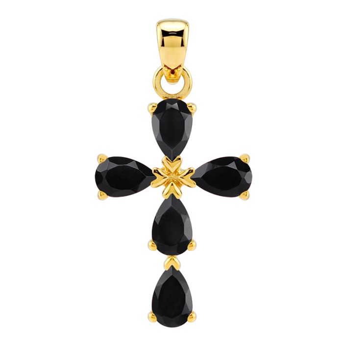 Om Kors med 5 Sort Onyx - 25mm - u/kæde - Forgyldt