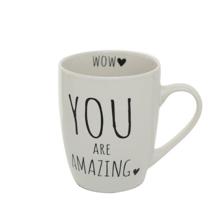 Flot krus med påtryk "You are Amazing" udvendig og et lille hjerte indvendig med teksten "Wow"