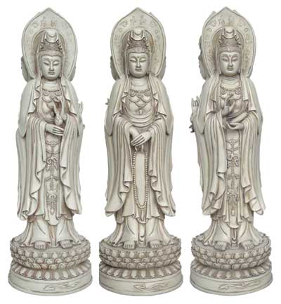 Denne smukke Kuan-Yin-figur har mange fine detaljer og viser tre meget smukke sider af det feminint guddommelige: I den ene holder hun en lotusblomst, der symboliser renhed og oplysning. I den anden en skriftrulle, der er symbolet på oplyst visdom, og i den tredje holder hun en mala – symbolet på meditation og på