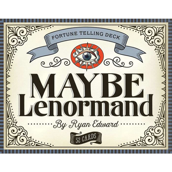 Maybe Lenormand hylder Lenormand-traditionen med stiliserede illustrationer, der formidler kernebetydningen i hjertet af hvert kort. Som en udvidelse af det klassiske 36-korts Petit Lenormand har designeren Ryan Edward skabt 16 ekstra kort for at fuldende et sæt på 52 kort, i tråd med arven fra spådomskort baseret på almindelige spillekort.