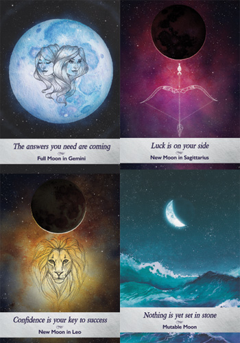 Kortene giver svar på brugerens spørgsmål om dennes liv samtidig med at man lærer om månens faser og positioner. Hvert kort har navn efter den specifikke fase månen er i eller dens position i stjernetegn eller astrologiske huse. Hvert kort vil vise hvordan månepositionens energi relaterer til områder i livet: livsmål, kommunikation, forhold, nye begyndelser, helbred, kærlighed, arbejde, drømme, healing, succes, familie, hjem, penge, rejser, og venner. Kortene vil også give vejledning om det bedste skridt fremad eller ting der er relevante at reflektere over. Med magiske og mystiske illustrationer er dette sæt en smuk og vis ven for dem, der ønsker at arbejde med månens kraft.