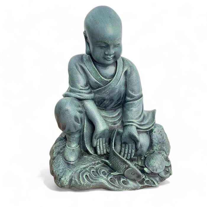 Smuk munke statue i en rolig og fredfyldt stilling. Foran munken er der detaljerede udskæringer af en fisk og en skildpadde, hvilket kan symbolisere harmoni med naturen. Den korresponderer også til det smukke buddhistiske ordsprog eller bøn, "Må alle væsener være frie"