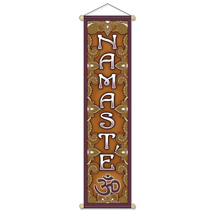 Dette banner er udsmykket med "Namaste" skrevet i store, hvide bogstaver med en mørk skygge. Baggrunden er en brun farve med dekorerede mønstre i guld og hvid, der ligner blomster eller mandala-designs og nederst er OM symbolet, som er et helligt symbol i hinduismen. Trykt på blødt polyester. Stoffet ligner silke, men er mere holdbart og langvarigt