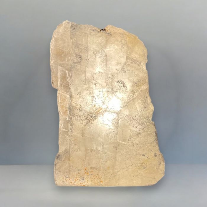 Hver FÉ Luminous lampe er unik – formet af ægte Maria Glas (Marienglas selenit), et sjældent og transparent krystalmineral, der blev brugt i gamle kirkevinduer. Dens naturlige skønhed og subtile lysspil skaber en elegant balance mellem moderne design og jordens rene elementer.
