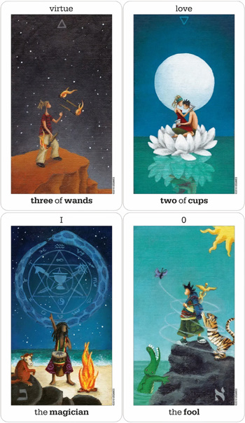 By playfully incorporating mythology and astrology, Vanessa Decort brings unique interpretations to traditional tarot, presenting a deck that is both insightful and accessible. The Sun and Moon Tarot follows the traditional structure of Crowley Thoth Tarot. The Minor Arcana features Crowley’s key words at the top of the cards, with the card titles and numbering at the bottom. Major Arcana cards show the associated Hebrew letter in the artwork. Sun and Moon Tarot is a multi-cultural tarot deck with symbolism borrowed from Hinduism, yoga, ancient Egyptian and classical Greek mythology, the I Ching, and Runes. The instruction booklet includes astrological associations and explanation of the Hebrew letters, as well as card meanings. Sun and Moon is a interesting and appealing tarot deck.