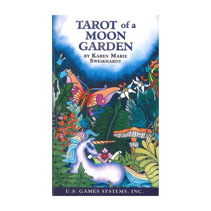 Tarot of a Moon Garden leverer sine mystiske hemmeligheder på vingerne af guldsmede, sommerfugle, engle, og feer. Enhjørninger og delfiner bringer indsigtsfulde budskaber fra fjerne lande. Dette strålende sæt sammenvæver traditionel tarotsymbolik, elementær magi, og månens reflekterende faser. Tarot of a Moon Garden har de traditionelle fire serier hvor guldsmede her danner håndtaget på sværdene. Drager angiver områder for transformation og advarer om fristelser. Lad Månens energi i månehaven inspirere dig, mens du udforsker de steder, din fantasi vil tage dig.