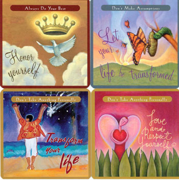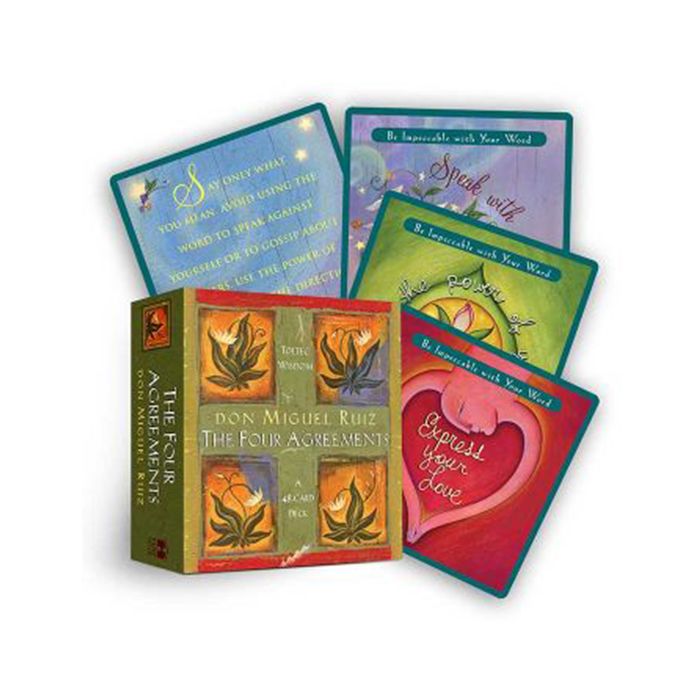 Baseret på Don Miguel Ruiz 'New York Times bestseller bog, De fire leveregler, giver disse kort en simpel og kraftfulde adfærdskodeks for at nå personlig frihed og sand lykke. Der er 12 kort, der svarer til hver af de fire leveregler.