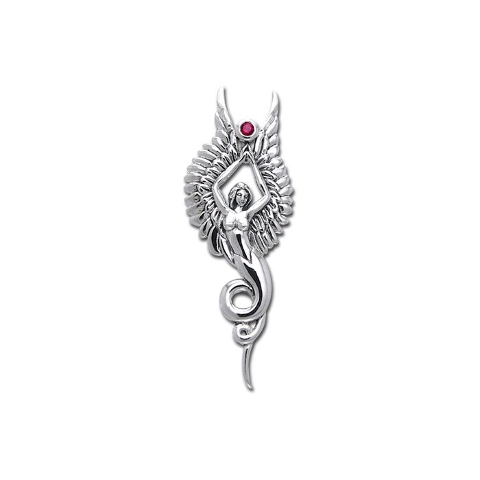 Sødt sølv vedhæng formet som en engel og indfattet med Rubin