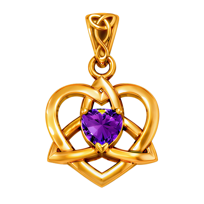 De flettede hjerter danner et karakteristisk keltisk knudemønster, der symboliserer kærlighedens uendelighed, følelsesmæssig harmoni og stærke forbindelser. Mønstret afspejler livets sammenhæng og forbindelsen mellem sind, krop og sjæl. I centrum sidder en hjerteformet ametyst, en ædelsten der gennem tiderne har været forbundet med ro, intuition og spirituel klarhed. Ametysten siges at støtte mental balance, indre fred og bevidsthed og fungerer som et symbol på indsigt og indre styrke.
