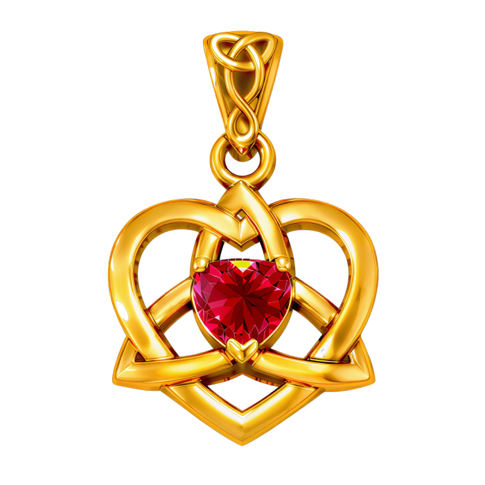 De sammenflettede hjerter danner et harmonisk keltisk knudemønster, der symboliserer evig kærlighed, stærke forbindelser og indre balance. I centrum stråler en hjerteformet rubin, kendt som kærlighedens og livskraftens sten. Rubinen forbindes ofte med passion, mod, styrke og hjertets energi og siges at understøtte både vitalitet og følelsesmæssig klarhed.