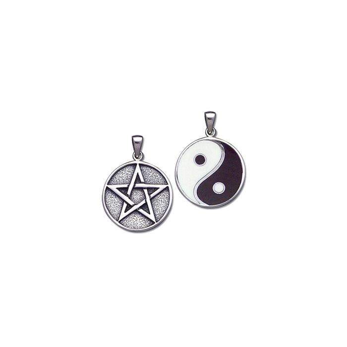 Flot vedhæng med et Pentagram på den ene side og Yin Yang på den anden side udført i sølv